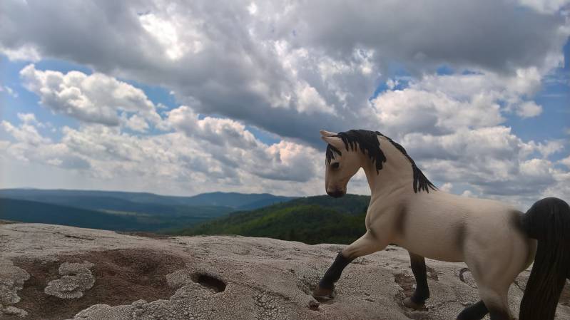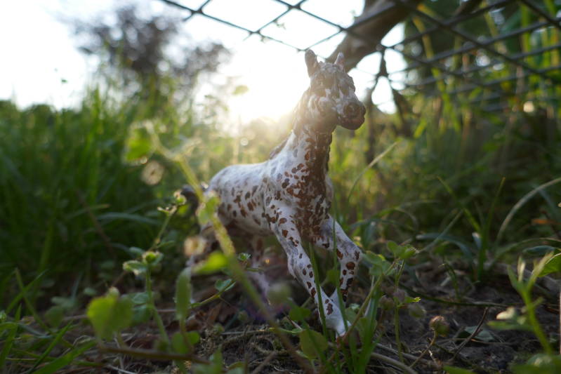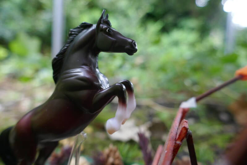 Bijzonderheden: Ook dit paardje is van Breyer, dit is een stablemate, dus helaas ook niet geschikt voor lessen en buitenritten. Wel doet hij aan vrijspringen zoals op de foto te zien is, hij word ook gebruikt voor fotoshoots zo nu en dan. Verder is hij een pittig paard, dat zich niet zomaar laat vangen uit de weide en nog wel eens de neiging heeft flink te bokken wanneer hij mag springen.